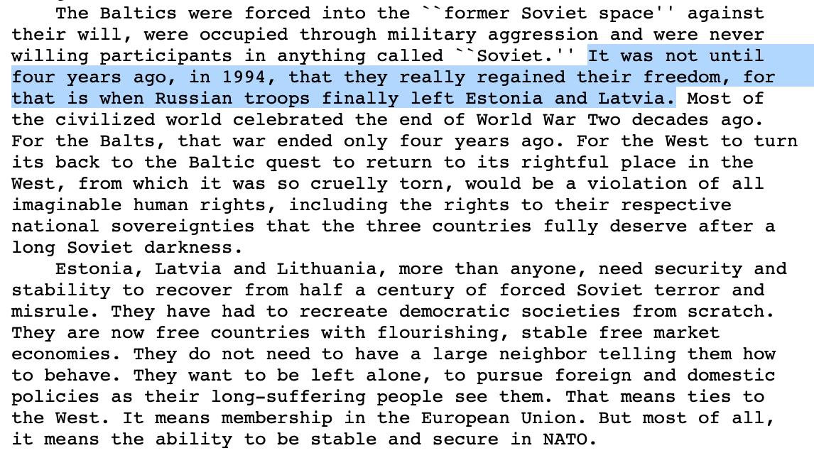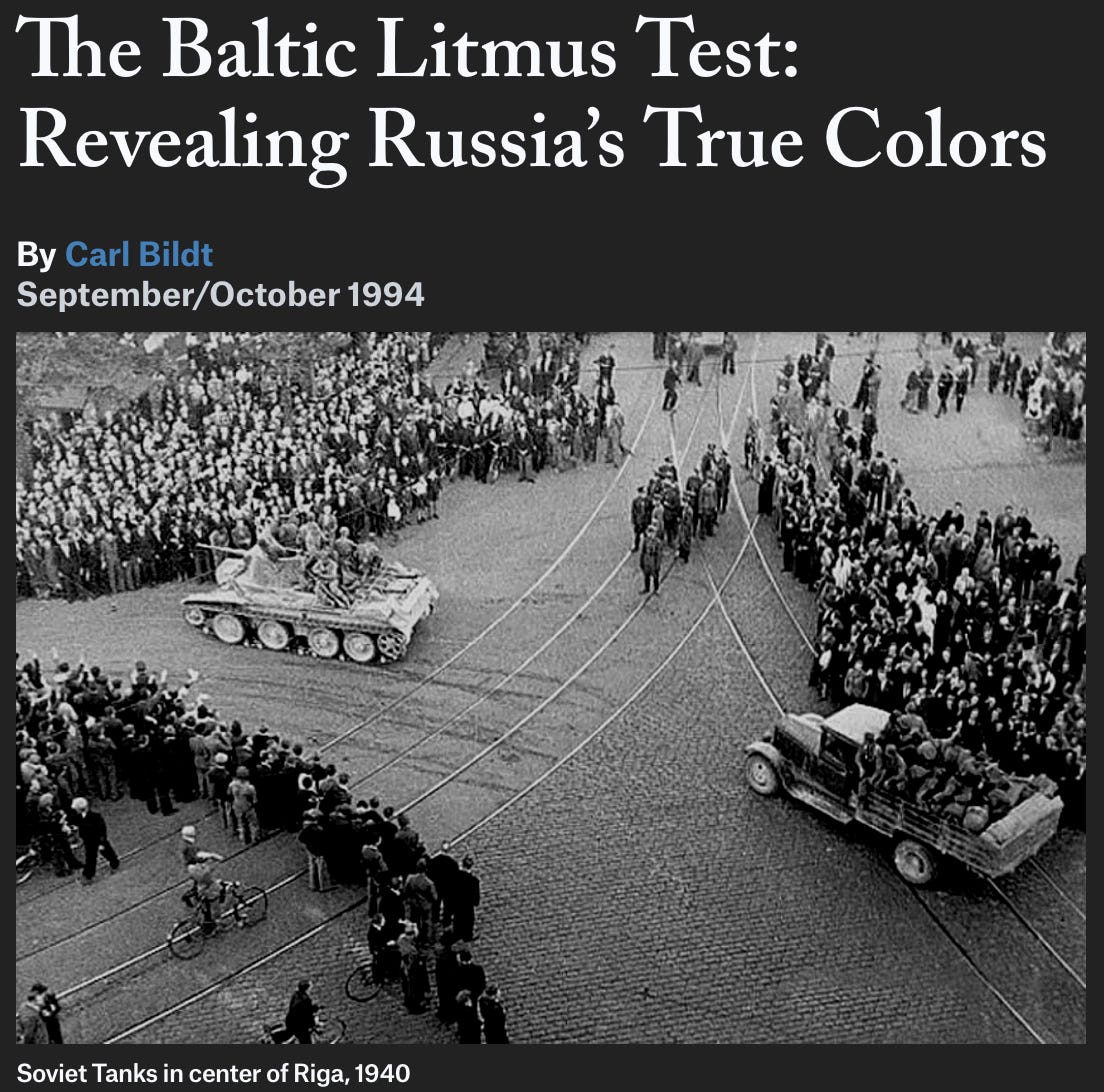 After the dissolution of the USSR in 1991, NATO began facing a crisis of purpose. In September 1994, Sweden’s Prime Minister Bildt wrote an article for Foreign Affairs in which he framed Russia’s treatment of the Baltics as a litmus test of “Russian legitimacy.”