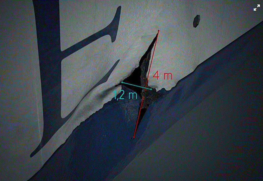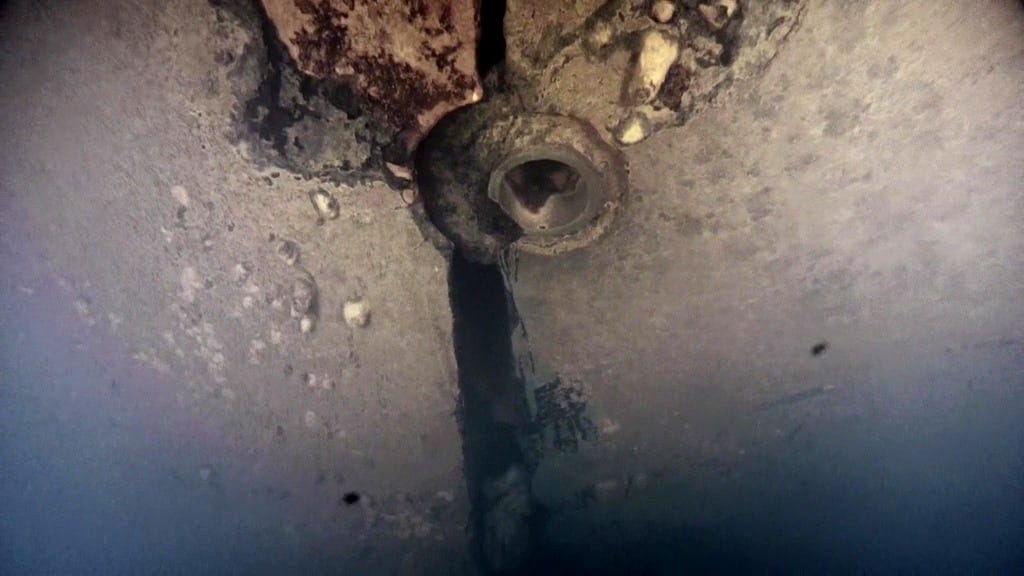 During the dive, the ROV finds previously unrecorded damage: a massive 4-meter gash in the starboard hull below the ship’s waterline. The steel hull on the sides of the large hole is pushed inward as if subjected to a very large but blunt force.