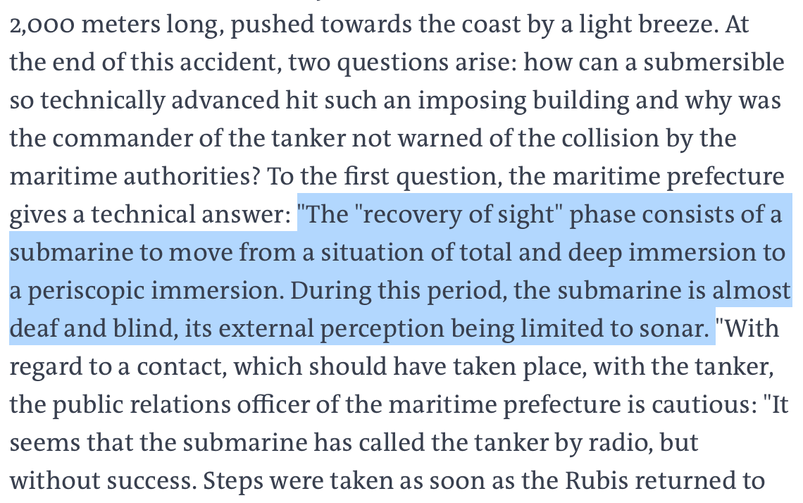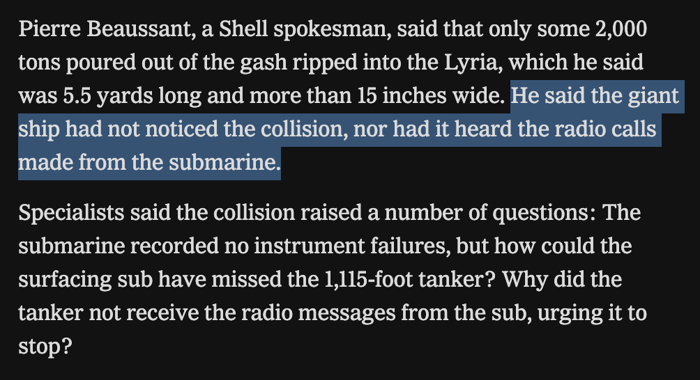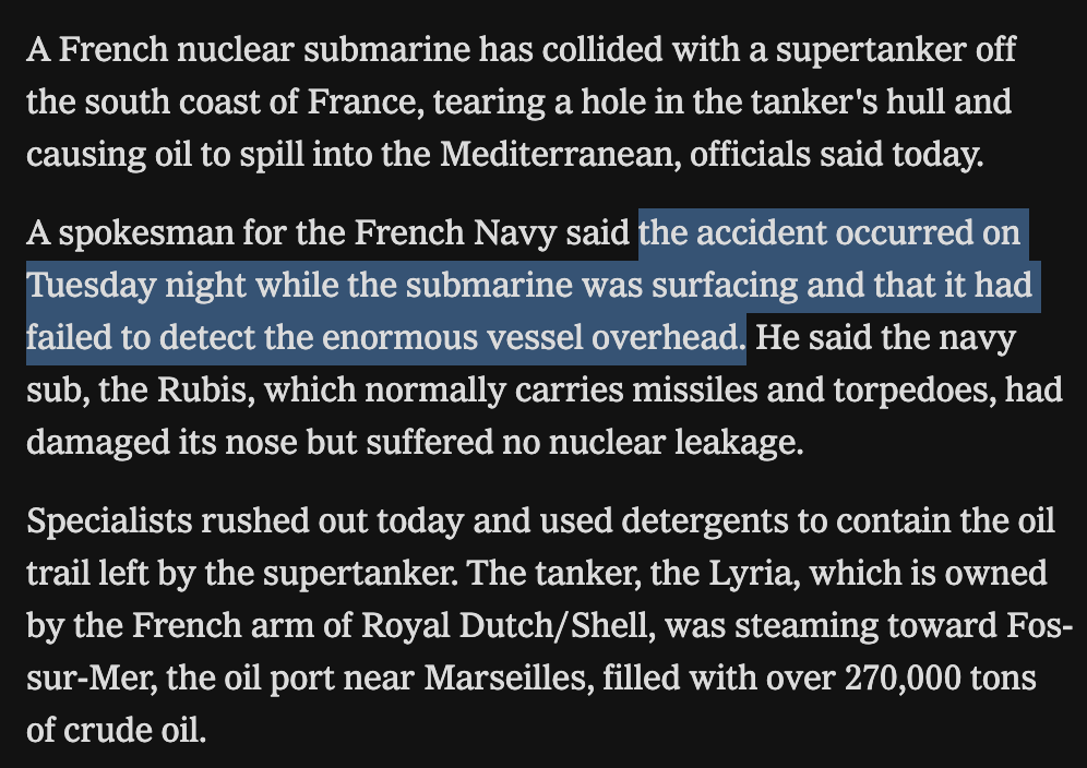 On the night of Aug 17, 1993, a French nuclear sub collided with an oil tanker off the coast of France while surfacing, tearing a 5 m hole in the tanker's hull, causing oil to spill into the sea. The tanker’s crew reported never receiving a call from the sub after the collision and only discovered the hole when they arrived back at port.