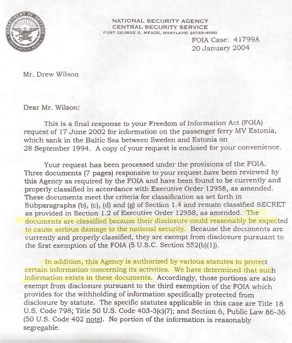 In 2004, author Drew Wilson submitted a FOIA request for any US govt info on the sinking. Despite no Americans aboard and no official US involvement during any stage of the accident, the NSA refused on the basis of national security.