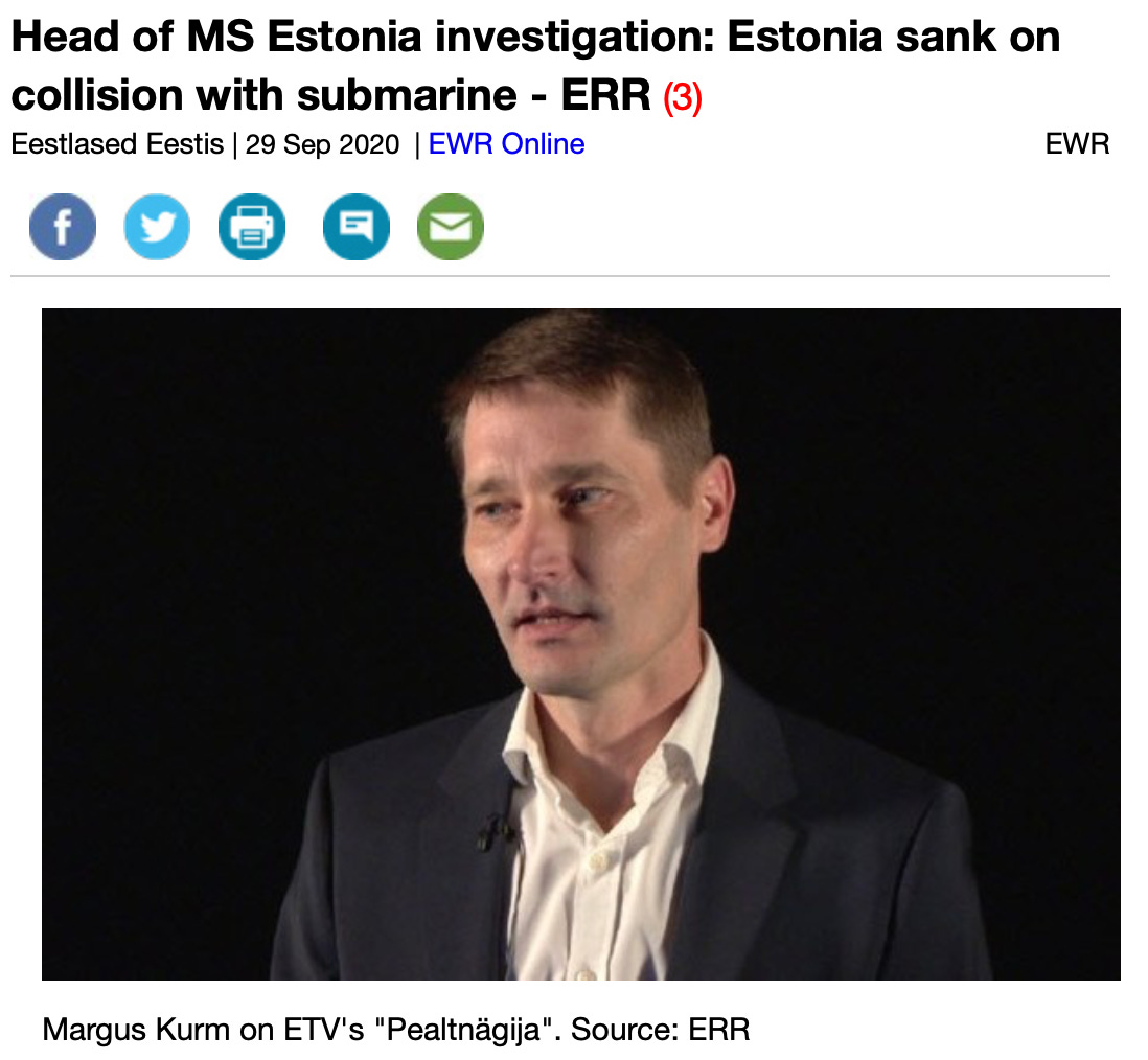 Shortly after the new footage aired, Margus Kurm, who had from 2005-09 been chairman of the committee tasked by the Estonian government to investigate the sinking, makes a statement to the press that, after seeing a video of the damage, he now believes the most likely cause of Estonia’s sinking is that is was hit by a submarine.