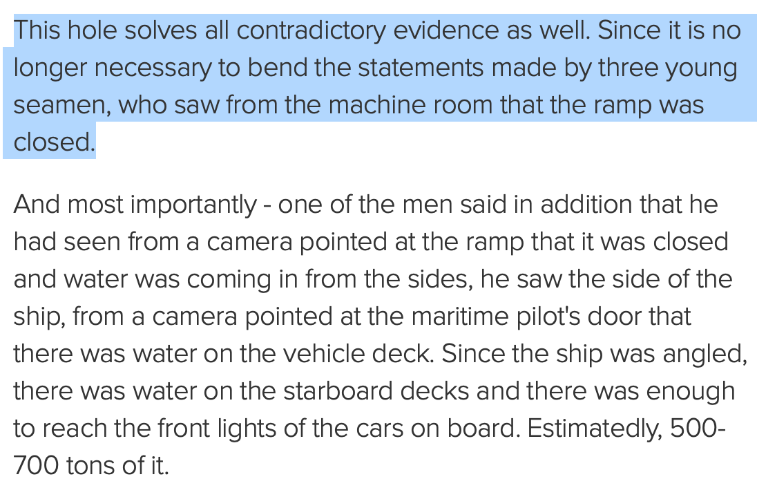 A cover story involving the bow visor is hatched and disseminated to the Swedish Prime Minister within hours. This theory is pushed onto key witnesses, and the media faithfully runs with the bow visor explanation before the official investigation has even begun.