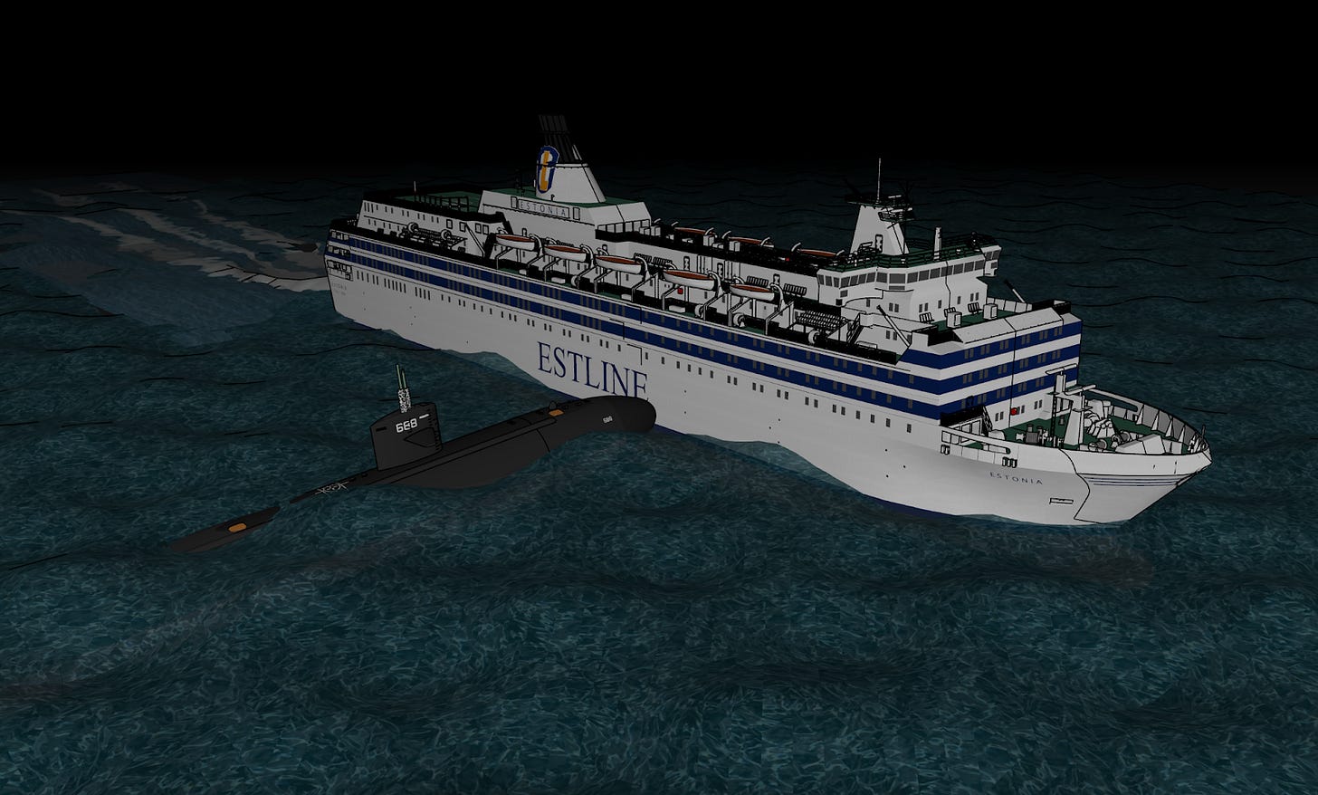 A surfacing NATO sub mistakenly collides with Estonia at 01:02. The nose of the sub impacts the starboard hull at close to a perpendicular angle. The damage to the sub is survivable and it covertly returns to port. The collision leaves Estonia with a 4 m hole below water level.